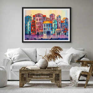 Affiche dans un cadre noir - Poster - Maisons colorées au bord de l'eau dans un style pictural - 50x70cm - Une ville comme dans un conte de fées - Décoration murale moderne pour le salon et la chambre ARTTOR