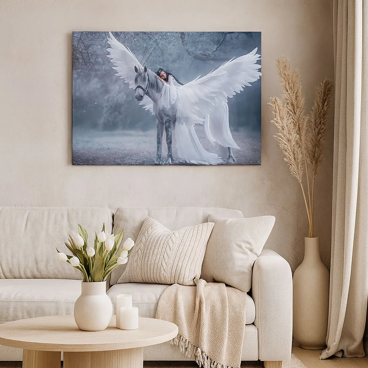 - Ce tableau représente une femme sur un cheval blanc ailé, baignée par l'atmosphère magique d'une forêt. C'est la décoration idéale pour les intérieurs qui souhaitent intégrer une touche de mystère et la beauté de la nature.