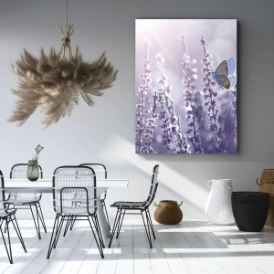 Impression sur toile - Image sur toile - Un papillon sur une lavande en fleurs dans la lumière du matin - 120x50cm - Baiser de papillon - Décoration murale moderne pour le salon et la chambre ARTTOR