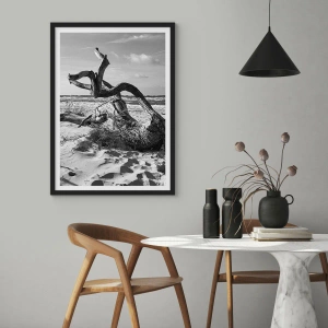 Affiche - Sculpture marine - Photographie noir et blanc d'un arbre sec sur la plage
