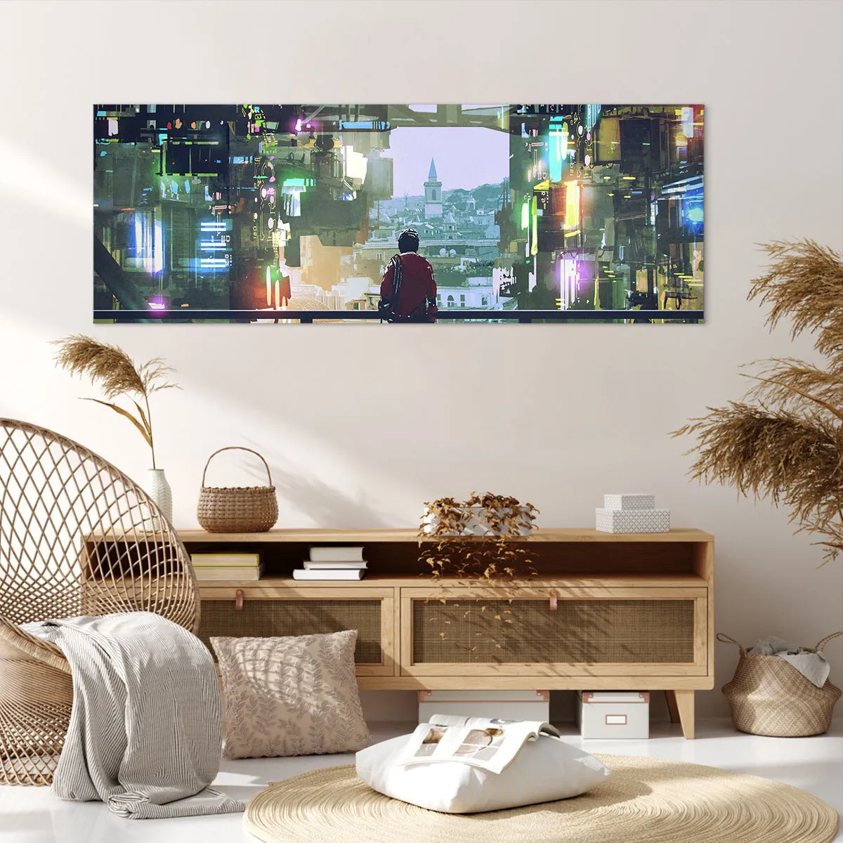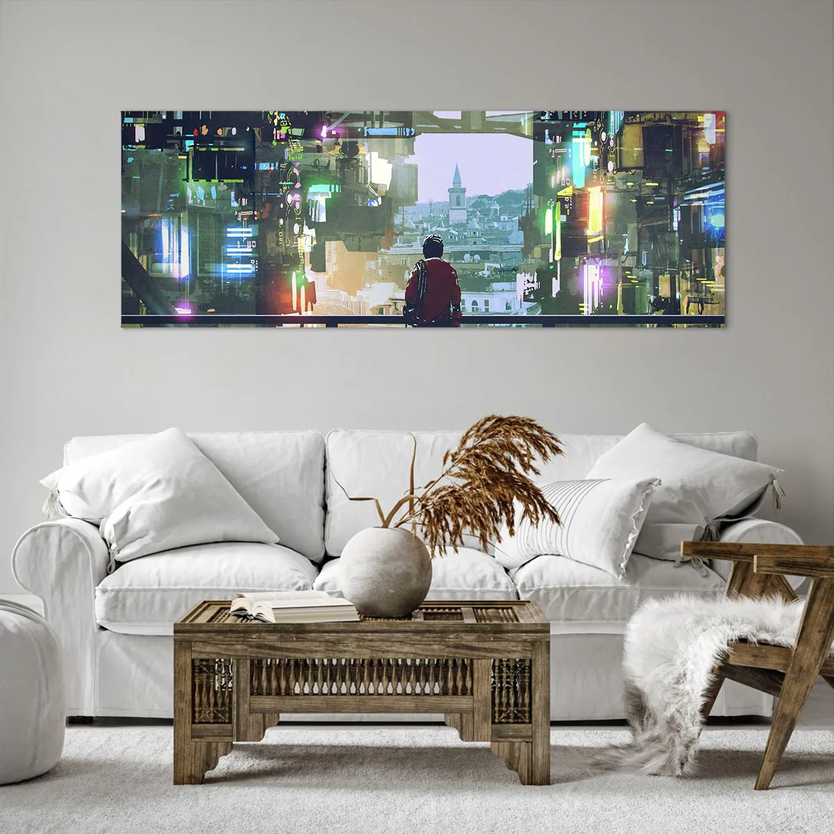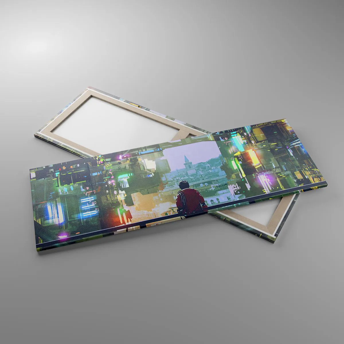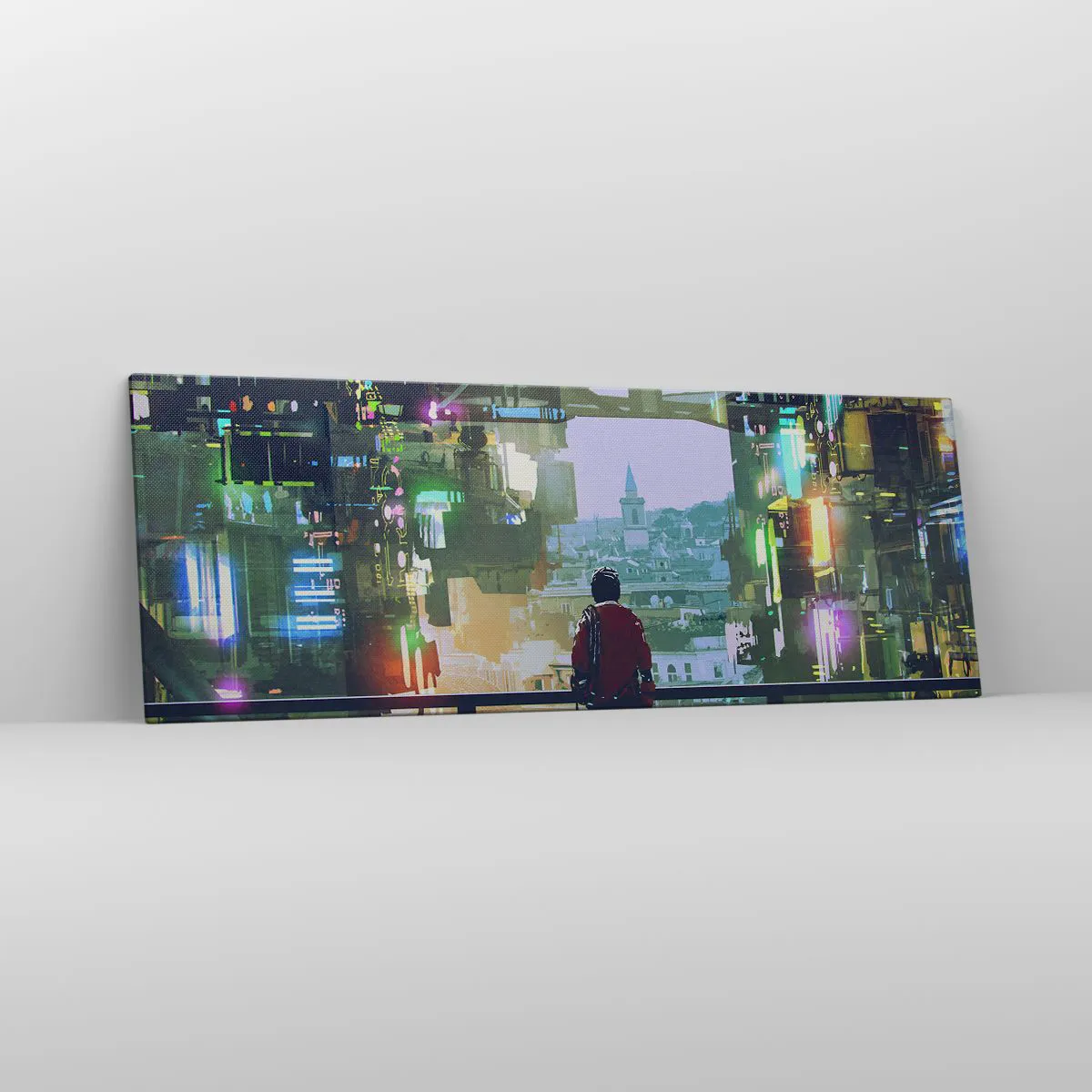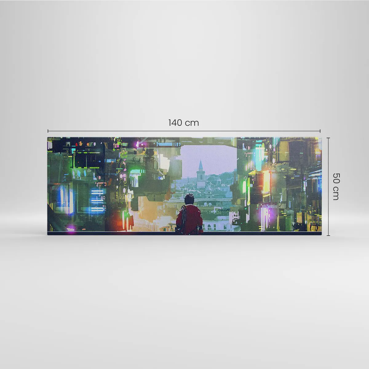 Impression sur toile - Image sur toile - Une silhouette dans une ville futuriste avec des néons - 140x50cm - Deux mondes - Décoration murale moderne pour le salon et la chambre ARTTOR