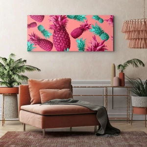 - Une toile imprimée représentant des ananas exotiques aux tons rose vif et turquoise. Une décoration moderne qui égayera votre intérieur et lui apportera une touche tropicale.
