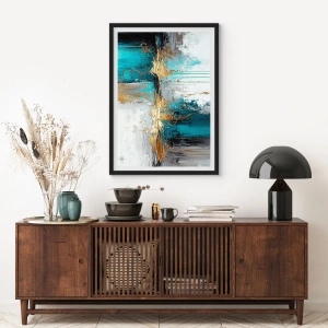 Affiche dans un cadre noir - Poster - Une composition abstraite aux accents turquoise et dorés. - 70x50cm - Tout coule - Décoration murale moderne pour le salon et la chambre ARTTOR