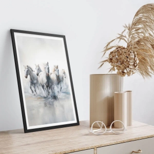 Affiche dans un cadre noir - Poster - Des chevaux blancs galopent dans l'eau - 70x50cm - Magie blanche - Décoration murale moderne pour le salon et la chambre ARTTOR