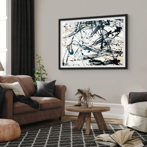 - L'affiche présente une abstraction expressive dans le style de la peinture gestuelle. Des lignes dynamiques et des touches contrastées de noir et de blanc créent une composition moderne et dynamique.