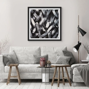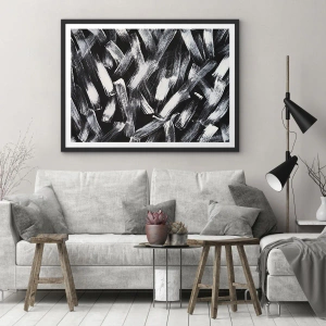 Affiche dans un cadre noir - Poster - Coups de pinceau blancs abstraits sur fond noir - 50x70cm - L'abstraction dans l'esprit industriel - Décoration murale moderne pour le salon et la chambre ARTTOR