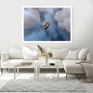 Affiche - Poster - Une personne dans un bateau flottant sur l'eau reflétant le ciel et les nuages. - 50x70cm - Vie – voyage – inconnu - Décoration murale moderne pour le salon et la chambre ARTTOR