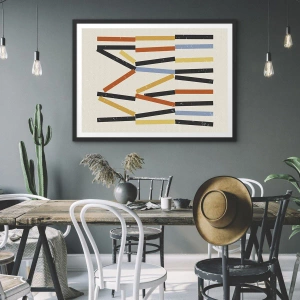 « Composition horizontale » est une affiche qui attire l'attention par sa forme géométrique et sa composition dynamique. Elle est créée par un agencement de lignes verticales de différentes couleurs contrastées, conférant à l'ensemble un aspect rythmé et harmonieux. La palette de couleurs minimaliste et la structure austère mais précise s'intègrent parfaitement dans un intérieur moderne.