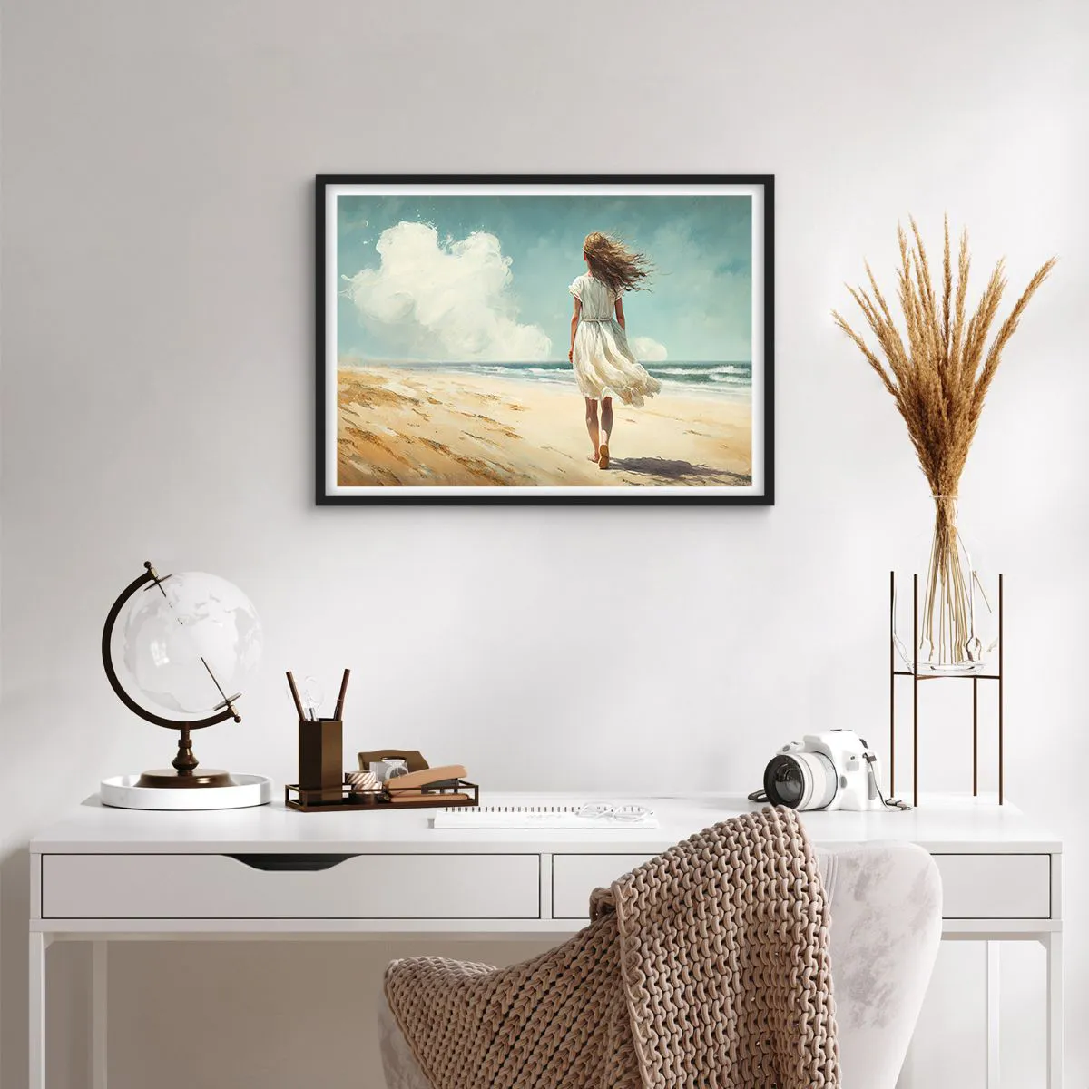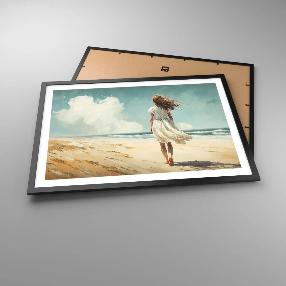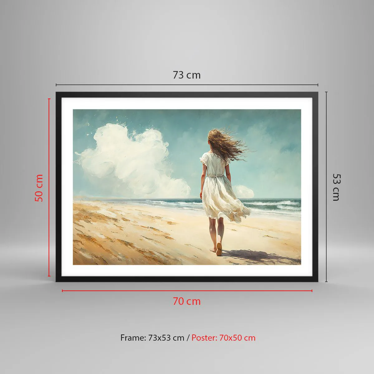 Affiche dans un cadre noir - Poster - Une femme en robe blanche marchant sur la plage par une journée ensoleillée - 70x50cm - Pour rencontrer le soleil et le vent - Décoration murale moderne pour le salon et la chambre ARTTOR