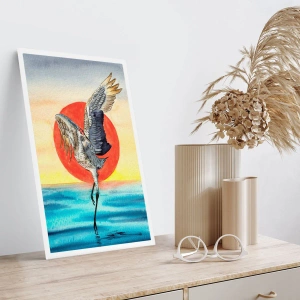Affiche - Poster - Une grue planant au-dessus de l'eau contre un soleil rouge - 50x70cm - Il est temps de rentrer - Décoration murale moderne pour le salon et la chambre ARTTOR