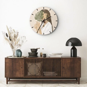 Horloge murale - Pendule murale - Portrait d'une femme avec une feuille de monstera sur fond beige - 30x30cm - Portrait mystérieux avec un éventail - Décoration murale moderne pour le salon et la chambre ARTTOR