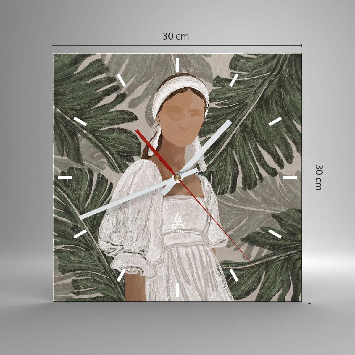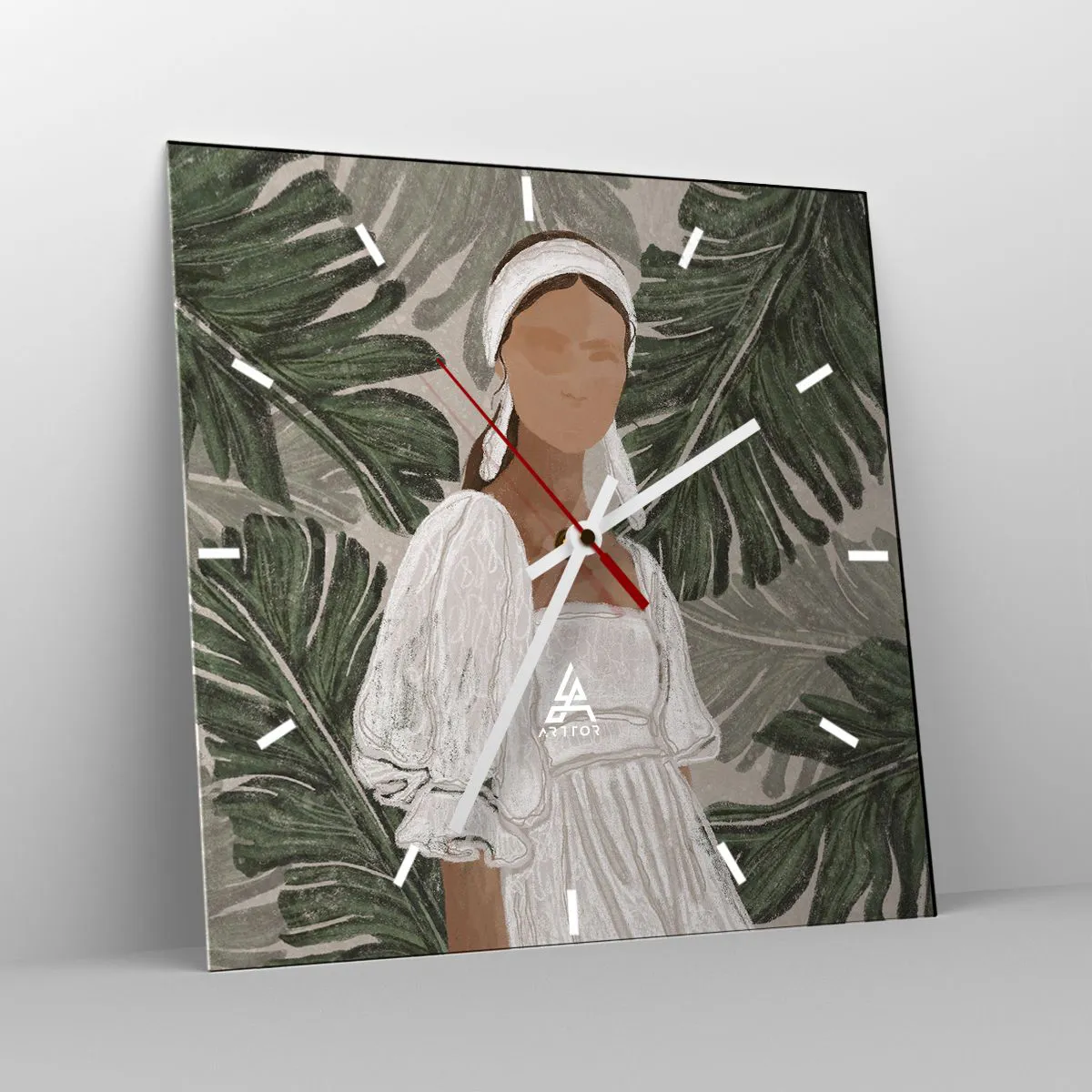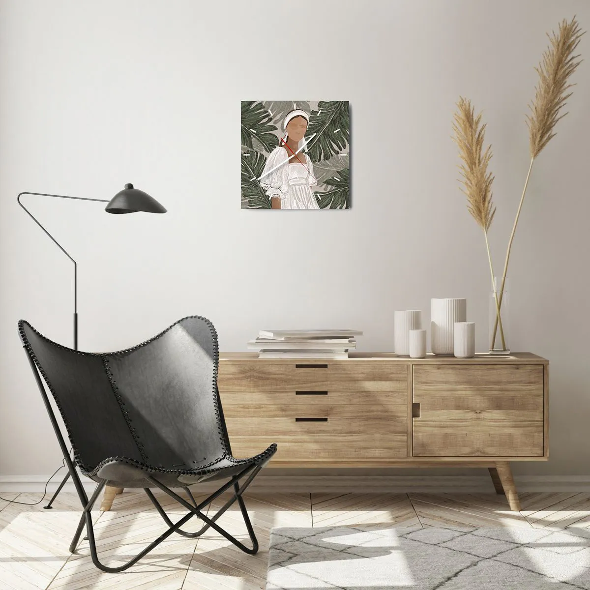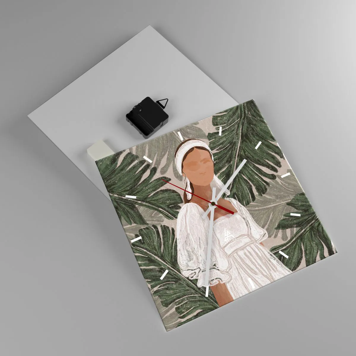 Horloge murale - Pendule murale - Portrait d'une femme en robe blanche sur fond de feuilles de monstera - 30x30cm - Portrait exotique - Décoration murale moderne pour le salon et la chambre ARTTOR