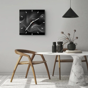 L'horloge est produite avec un verre de sécurité de 4 mm d'épaisseur. La technologie de fabrication de l'horloge est conforme à la classe de sécurité 2B2 selon la norme PN-EN 12600 : 2004, qui garantit la résistance aux chocs. L'horloge en verre est prête à être accrochée - elle a une attache en métal attaché à l'arrière et une entretoise en mousse régulant la distance uniformément de l'horloge par rapport au mur. L'horloge a un mécanisme flottant silencieux alimenté par une pile 1.5V - pile AA (pile non incluse).