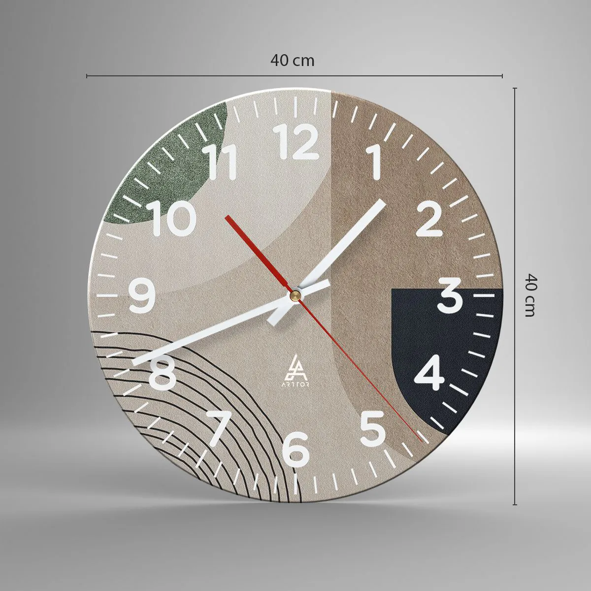 L'horloge est produite avec un verre de sécurité de 4 mm d'épaisseur. La technologie de fabrication de l'horloge est conforme à la classe de sécurité 2B2 selon la norme PN-EN 12600 : 2004, qui garantit la résistance aux chocs. L'horloge en verre est prête à être accrochée - elle a une attache en métal attaché à l'arrière et une entretoise en mousse régulant la distance uniformément de l'horloge par rapport au mur. L'horloge a un mécanisme flottant silencieux alimenté par une pile 1.5V - pile AA (pile non incluse).