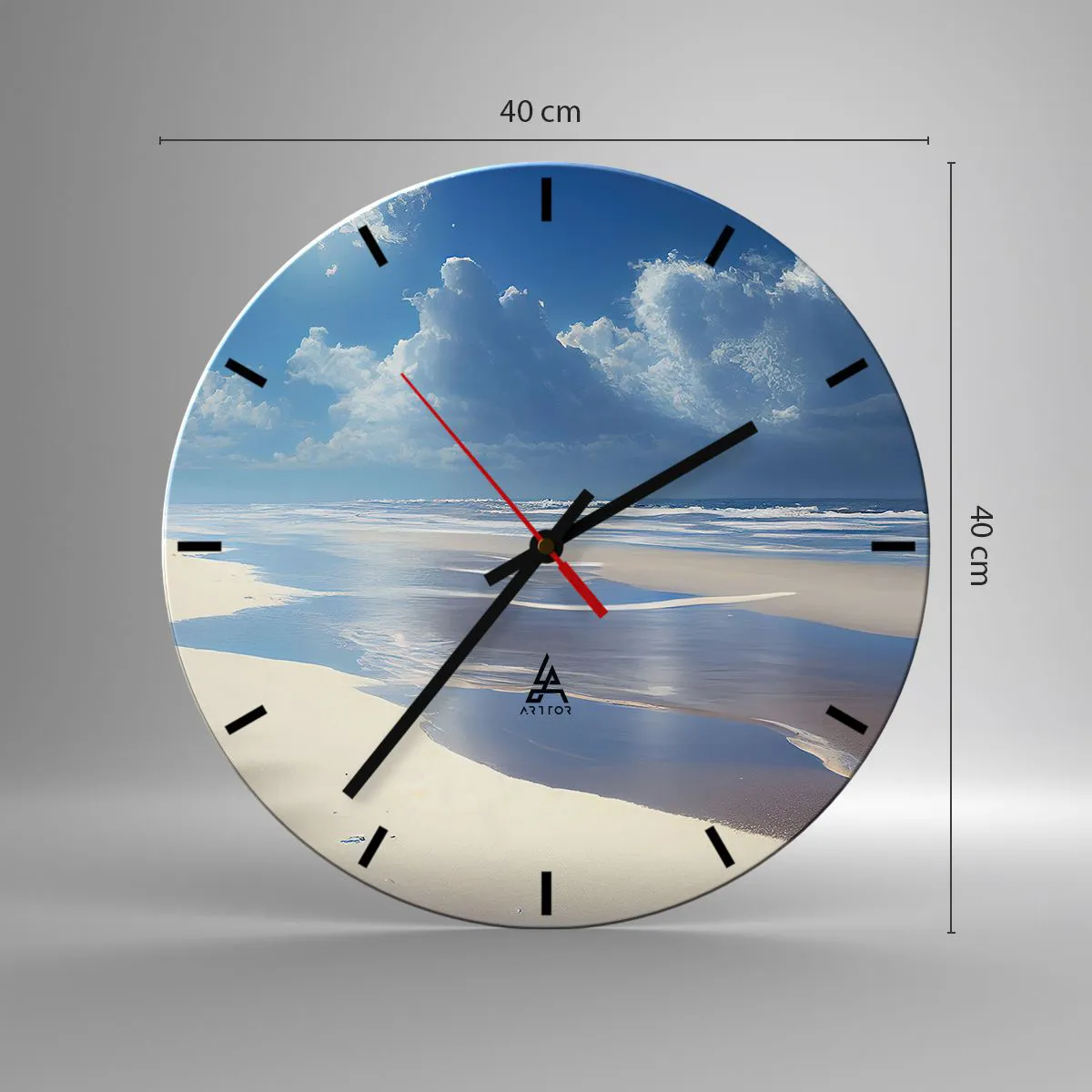 L'horloge est produite avec un verre de sécurité de 4 mm d'épaisseur. La technologie de fabrication de l'horloge est conforme à la classe de sécurité 2B2 selon la norme PN-EN 12600 : 2004, qui garantit la résistance aux chocs. L'horloge en verre est prête à être accrochée - elle a une attache en métal attaché à l'arrière et une entretoise en mousse régulant la distance uniformément de l'horloge par rapport au mur. L'horloge a un mécanisme flottant silencieux alimenté par une pile 1.5V - pile AA (pile non incluse).