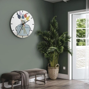 L'horloge murale Comment les graines de pavot allie fonctionnalité et illustration décorative dans un style minimaliste. Son cadran présente un motif représentant un simple vase avec des fleurs séchées dans des tons de jaune, bleu marine, rouge et lavande. Le fond et l'ensemble de la composition sont dans des couleurs pastel douces qui apportent paix et subtilité à l'intérieur.
