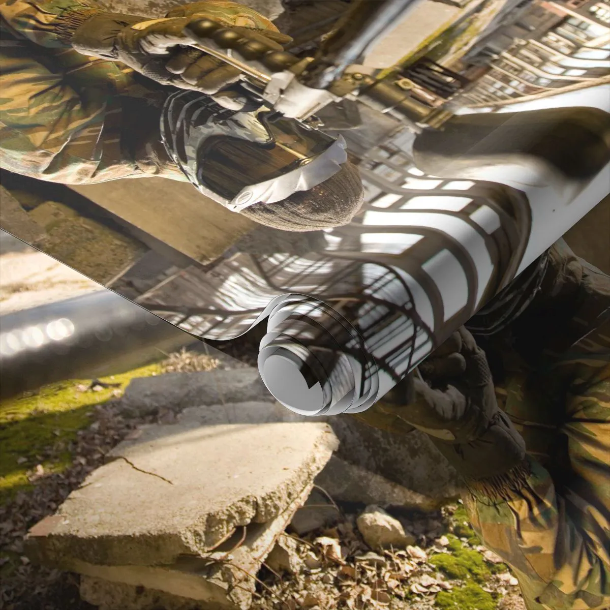 « Toi aussi, deviens un héros » est un fond d'écran photo dynamique qui capture l'instant d'une partie de paintball en milieu urbain. Un joueur en tenue de camouflage vise, se concentrant sur la tactique et la précision du tir. Le fond d'écran composé de bâtiments en ruines et d'un paysage industriel confère à l'ensemble une atmosphère militaire et austère.