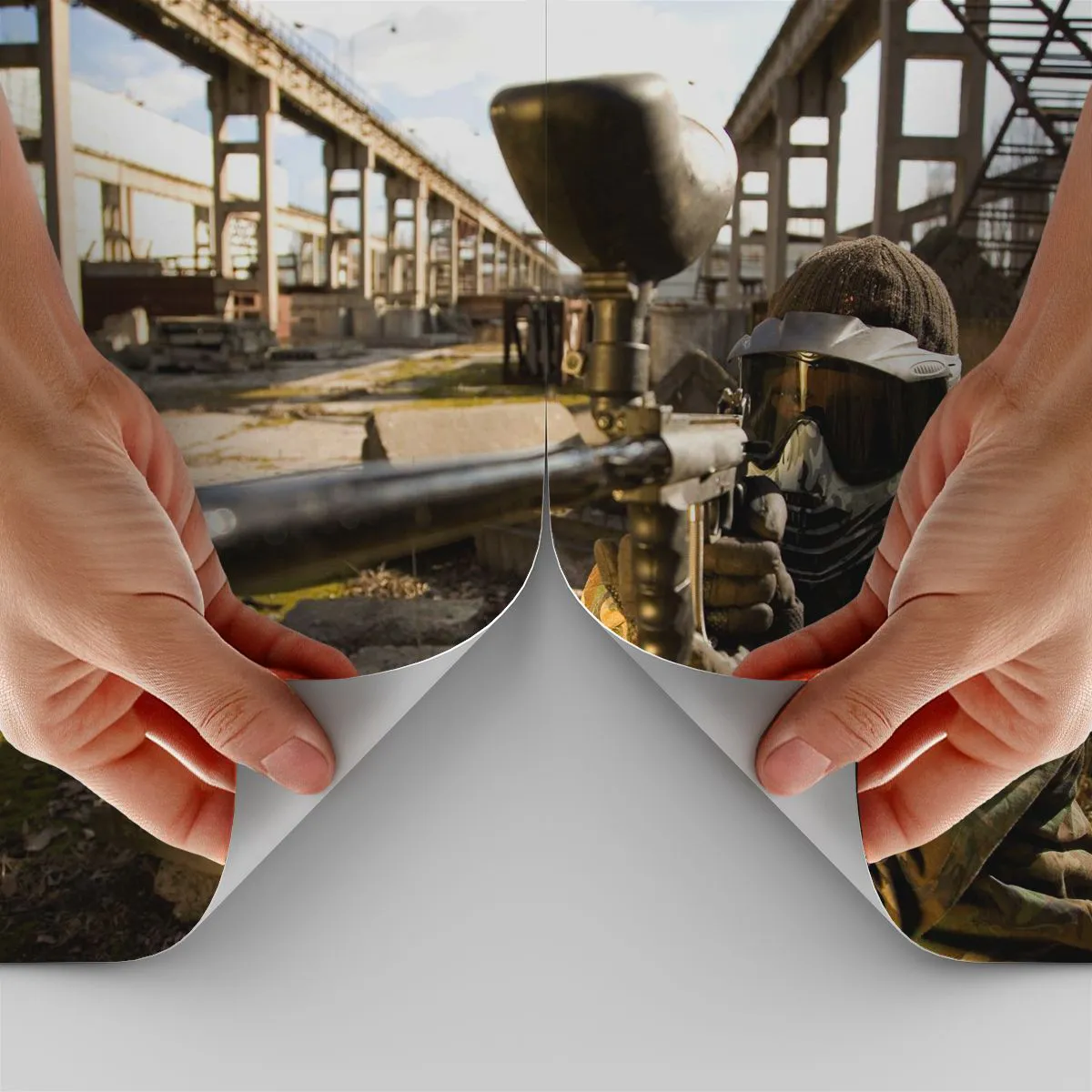 - La fresque représente un joueur de paintball en tenue complète, pointant son arme. Le décor de bâtiments en ruines ajoute une touche dynamique et tactique à la composition.