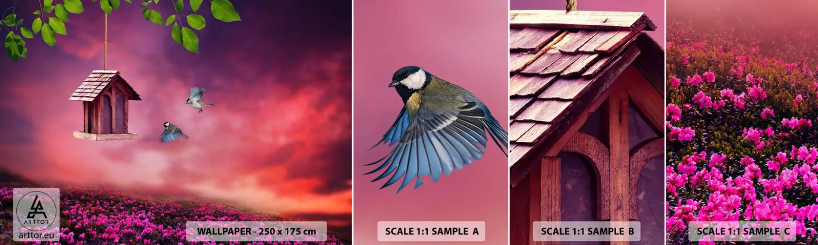 Échantillon De Papier Peint Standard Eco - Invitation à dîner - Paysage, Fleurs, Nichoir - 100x30 cm