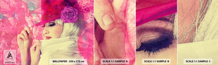 Échantillon De Papier Peint Standard Eco - Portrait rétro dans une brume rose - Femme au chapeau, Fleurs, Mode - 100x30 cm