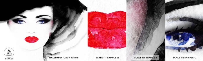 Échantillon De Papier Peint Standard Eco - Elle repousse et attire - Visage de femme, lèvres rouges, Yeux bleus - 100x30 cm