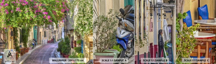 Échantillon de Papier Peint Premium Sand - Allée fleurie - Architecture, Grèce, Ville - 100x30 cm