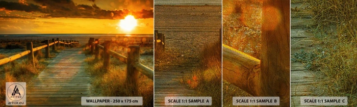 Échantillon de Papier Peint Premium Sand - Baigné dans le vieil or - Paysage, Mer, Descente à la plage - 100x30 cm