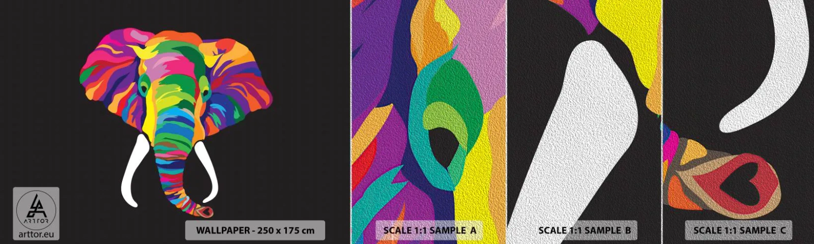 Échantillon de Papier Peint Premium Sand - L'éléphant qui aimait se baigner dans un arc-en-ciel - Animaux, Éléphant, Image colorée - 100x30 cm