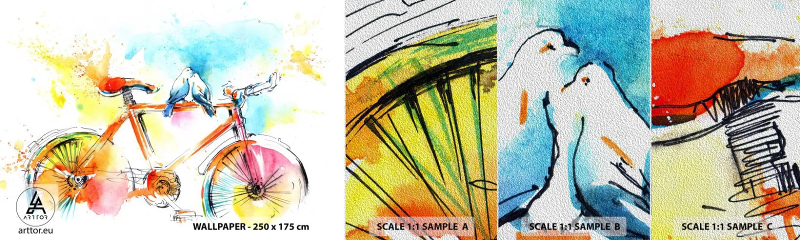Échantillon de Papier Peint Premium Sand - À deux en vélo - Abstraction, Vélo, Des oiseaux - 100x30 cm