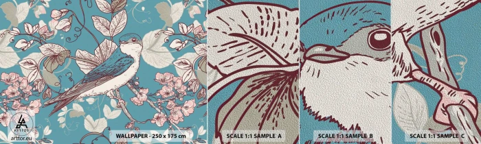 Échantillon de Papier Peint Premium Sand - Dans le bois blanc du rouge et de l'argent - Abstraction, Avaler, Oiseau - 100x30 cm