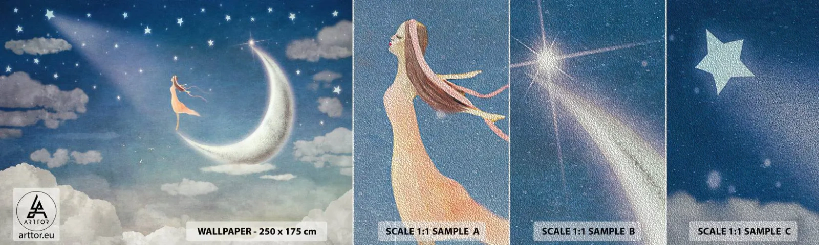 Échantillon de Papier Peint Premium Sand - Valise bleue - Abstraction, Pour les enfants, Lune - 100x30 cm