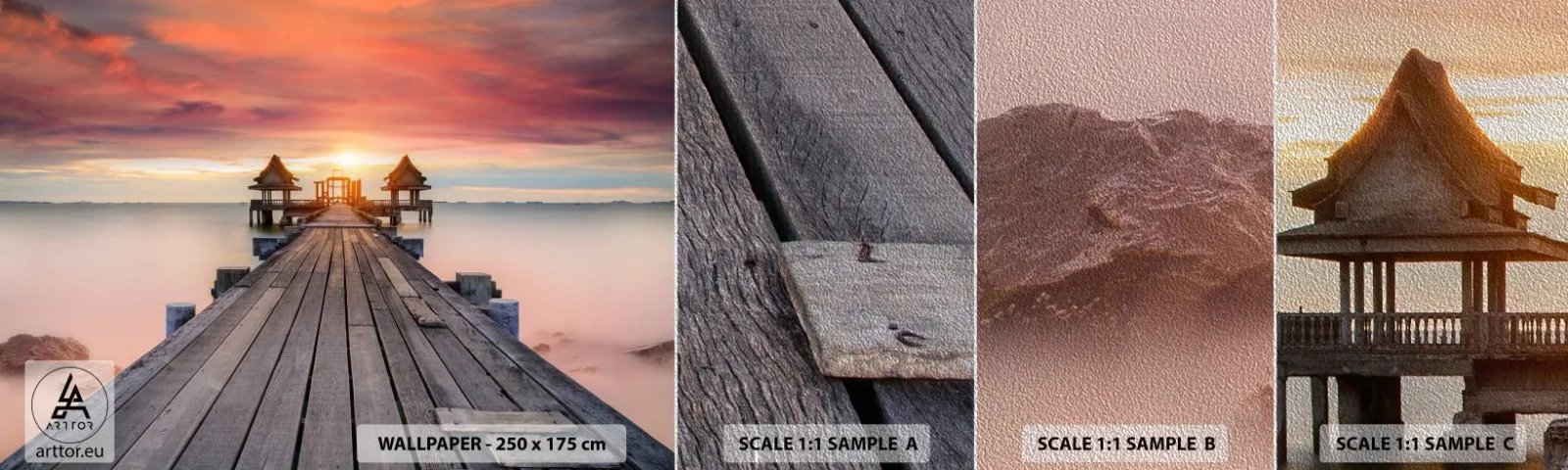 Échantillon de Papier Peint Premium Sand - L'Ouest à l'Est - Paysage, Jetée en bois, Mer - 100x30 cm