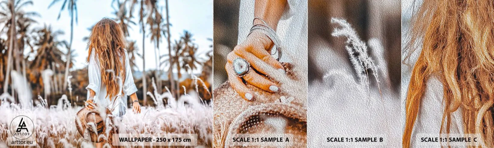 Wysoka Gramatura 290g/m2 wraz z odczuwalną strukturą Piasku na powierzchni tapety, czyni produkt ekskluzywnym i designerskim rozwiązaniem dla każdego amatora unikatowych dekoracji wnętrzarskich. Zaleta wyjątkowej grubości materiału to również doskonałe krycie, które jednocześnie znacząco ułatwia montaż. Struktura fototapety PREMIUM SAND sprawia wrażenie wydruku na drobnoziarnistej strukturze przypominającej piasek.