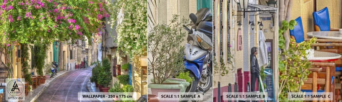 Échantillon de Papier Peint Premium Canvas - Allée fleurie - Architecture, Grèce, Ville - 100x30 cm