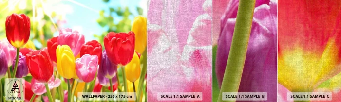 Échantillon de Papier Peint Premium Canvas - C'est nous, les couleurs de Mai! - Fleurs, Tulipes, Jardin - 100x30 cm