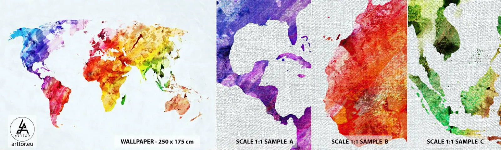Échantillon de Papier Peint Premium Canvas - Toutes les couleurs du monde - Carte du monde, Graphique, Continents - 100x30 cm