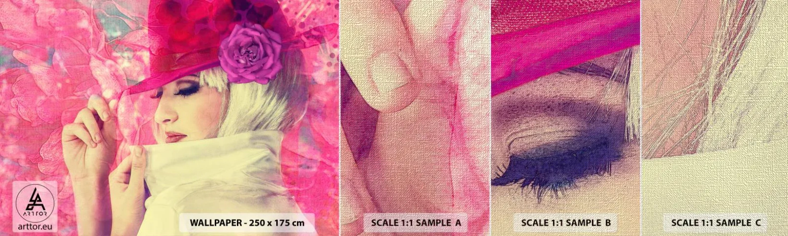 Échantillon de Papier Peint Premium Canvas - Portrait rétro dans une brume rose - Femme au chapeau, Fleurs, Mode - 100x30 cm