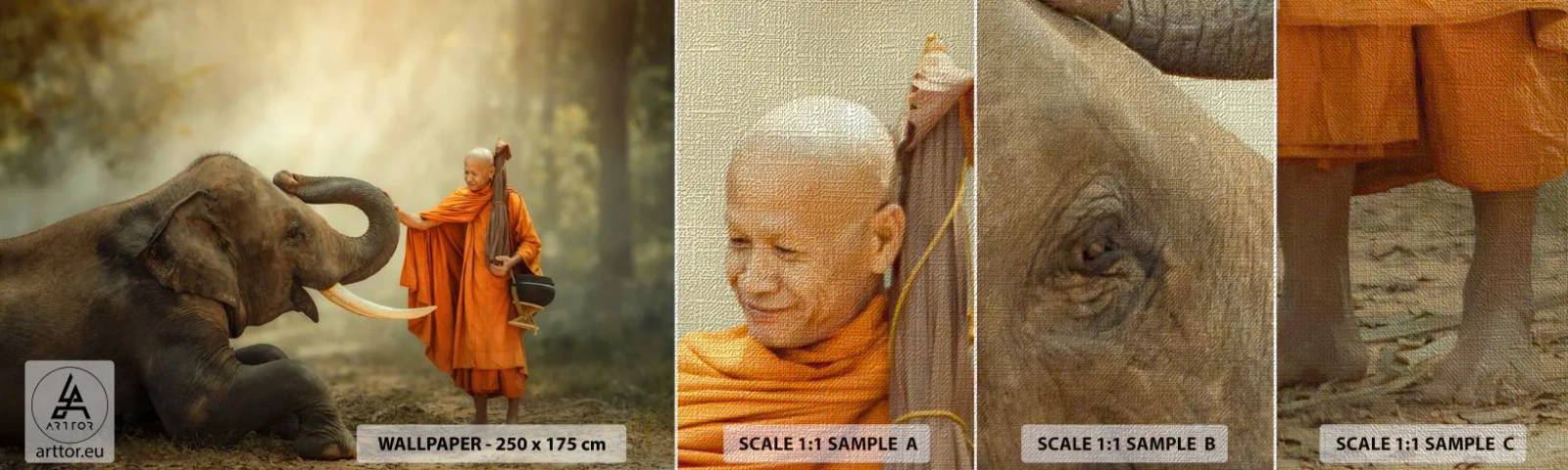 Échantillon de Papier Peint Premium Canvas - Rencontre en voyageant - Asie, Éléphant, Moine - 100x30 cm