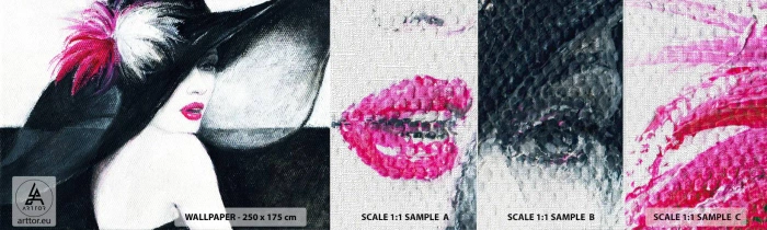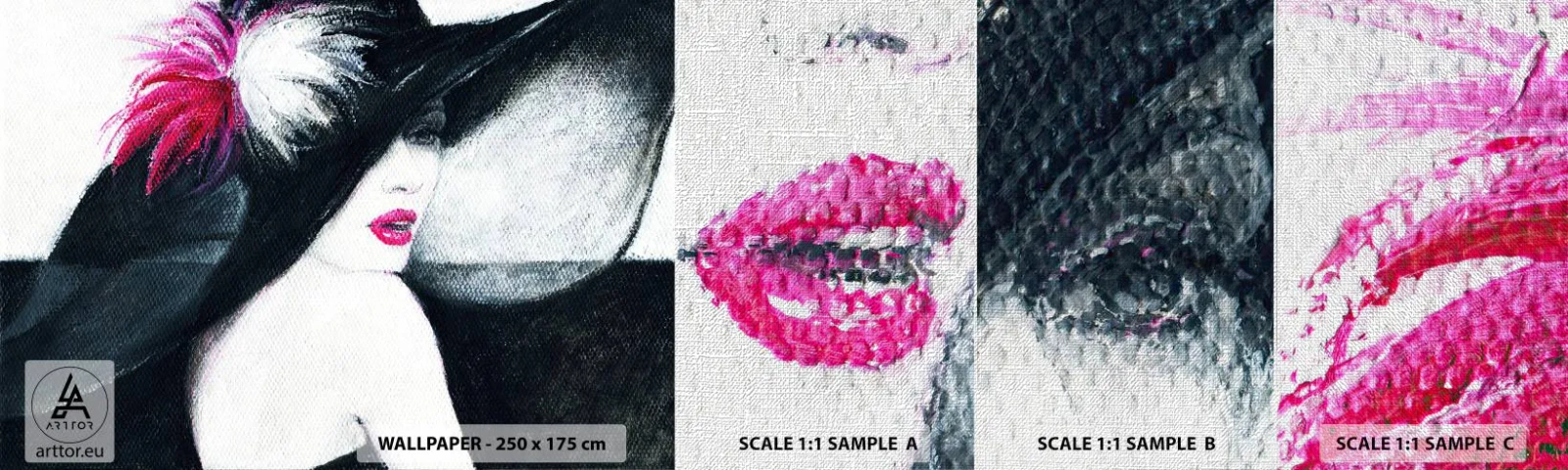 Échantillon de Papier Peint Premium Canvas - Toujours un secret - Femme au chapeau, Visage de femme, lèvres rouges - 100x30 cm