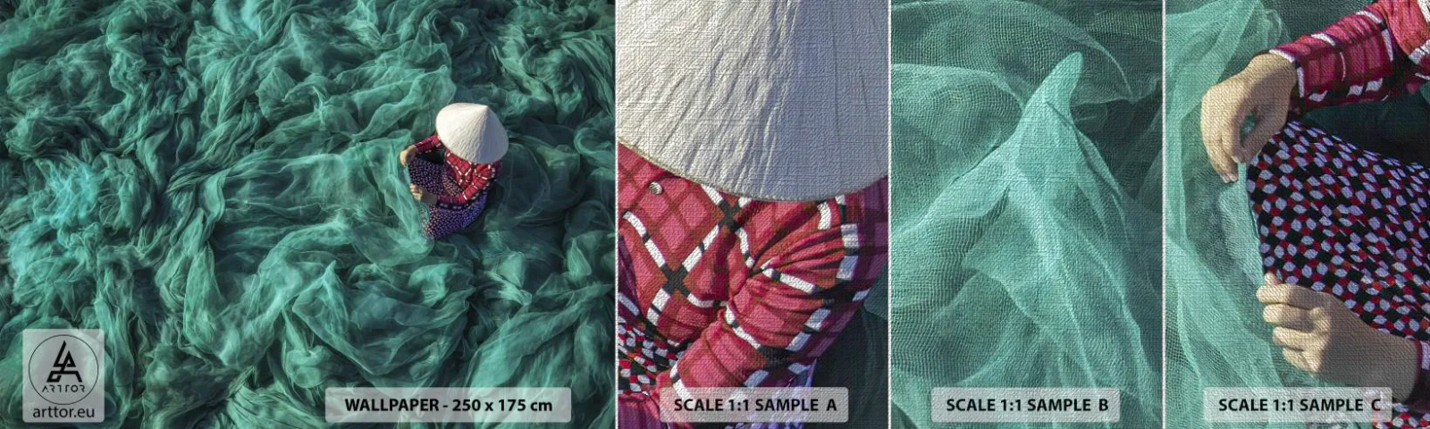Échantillon de Papier Peint Premium Canvas - Dans une mer de filet - Filet de pêche, Femme, Viêt Nam - 100x30 cm