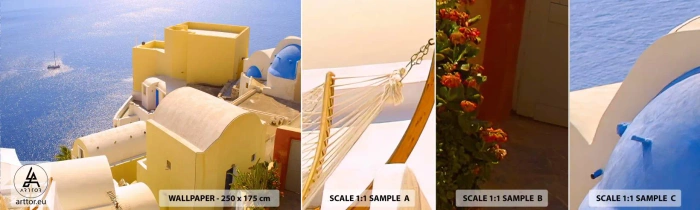 Échantillon de Papier Peint Autocollant Deluxe Sticker - Paysage grec en blanc et bleu ciel - Paysage, Santorin, Grèce - 100x30 cm