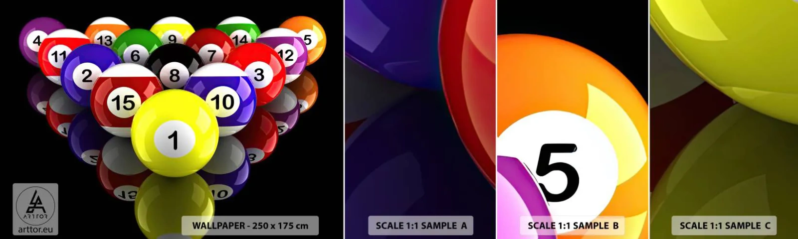 Échantillon de Papier Peint Autocollant Deluxe Sticker - Différentes couleurs de jeu - sport, Billard, Boules de billard - 100x30 cm