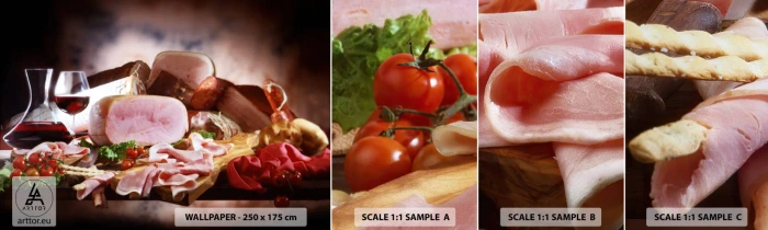 Échantillon de Papier Peint Autocollant Deluxe Sticker - Un rêve culinaire avec une carafe - La gastronomie, Viandes, Tomates - 100x30 cm