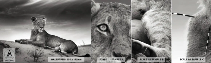 Échantillon de Papier Peint Autocollant Deluxe Sticker - La reine du désert reste - Animaux, Lion, Désert - 100x30 cm