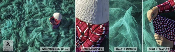 Échantillon de Papier Peint Autocollant Deluxe Sticker - Dans une mer de filet - Filet de pêche, Femme, Viêt Nam - 100x30 cm