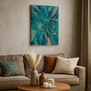 - Ce tableau présente un motif marbré texturé aux tons turquoise et doré. Cette composition élégante et glamour est parfaite pour décorer un salon, une chambre ou un bureau.