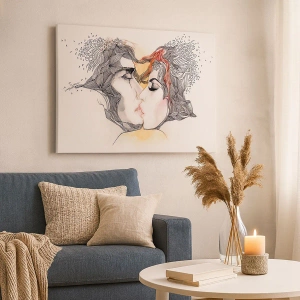 - Ce tableau représente le portrait artistique d'un couple s'embrassant tendrement. Les motifs abstraits incorporés dans les cheveux lui confèrent un caractère unique. Parfait pour un intérieur comme un salon, une chambre ou un bureau, il se distingue pa...