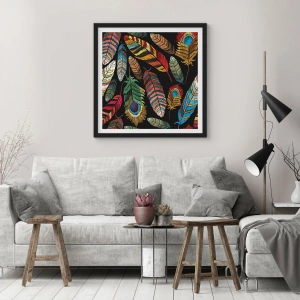 Affiche dans un cadre noir - Poster - Plumes colorées sur fond noir - 70x50cm - Le carnaval des oiseaux - Décoration murale moderne pour le salon et la chambre ARTTOR