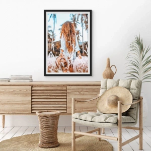 - L'affiche représente une femme en chemise blanche se promenant parmi les palmiers. Ses longs cheveux ondulés et son allure estivale ajoutent une touche d'insouciance et d'exotisme à la scène. Une décoration parfaite pour un style bohème et tropical.