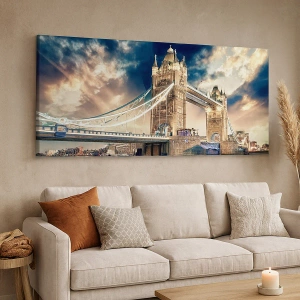 • Ce tableau représente le Tower Bridge à Londres, entouré des lumières du crépuscule et d'un ciel dynamique. Symbole de la ville dans toute sa splendeur, il est parfait comme élément décoratif dans les intérieurs élégants.
